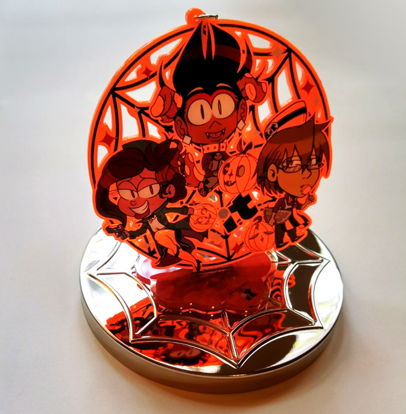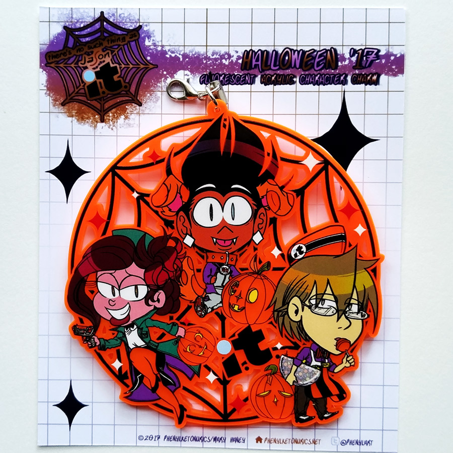 Single-sided die-cut acrylic fluorescent keychain featuring the main characters of There's No Such Thing as Jason. Glows under black light!