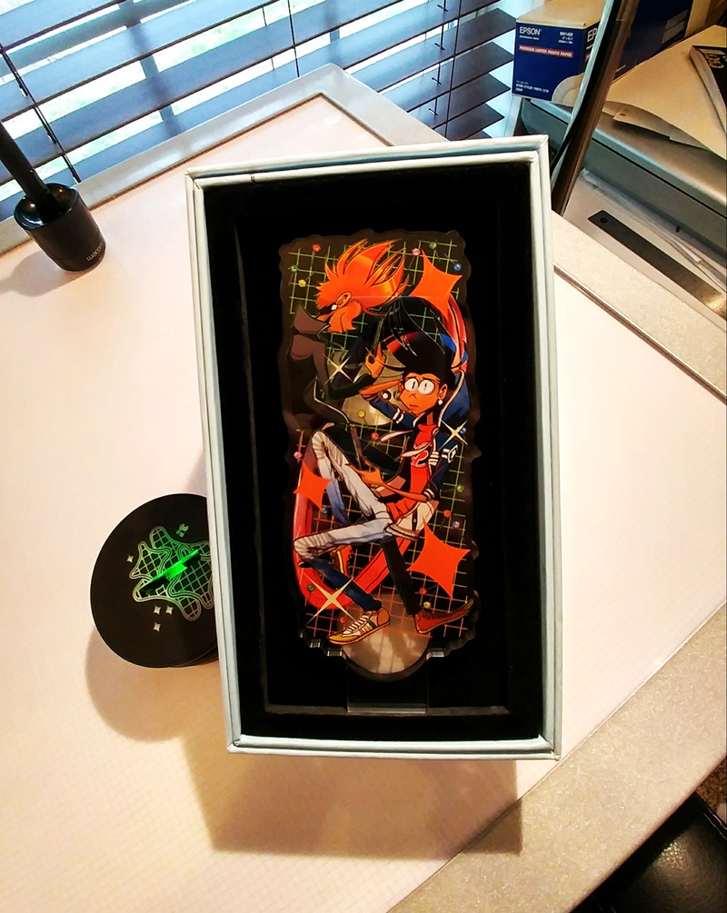 This 6.5" light-up LED acrylic standee haunts in 7 colours and can be set to 3 different modes via touch-button on the base (on/off, steady on, and multi-colour-shift mode).